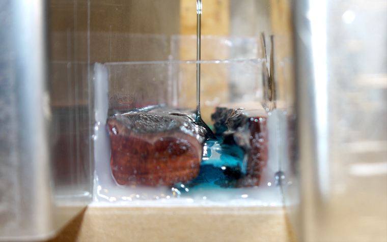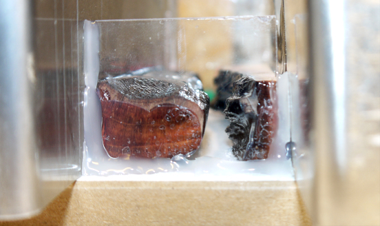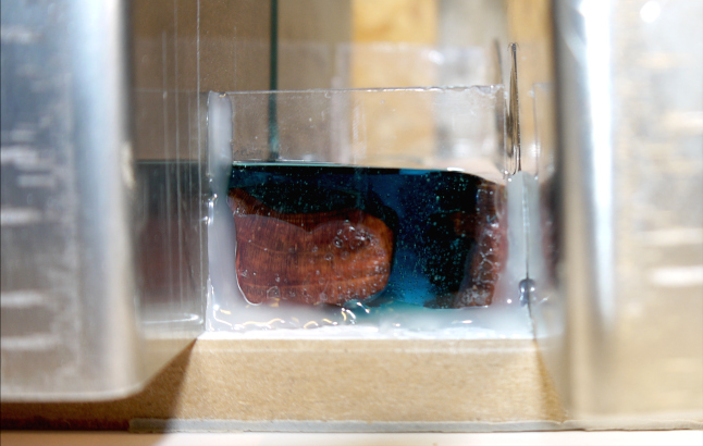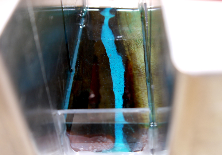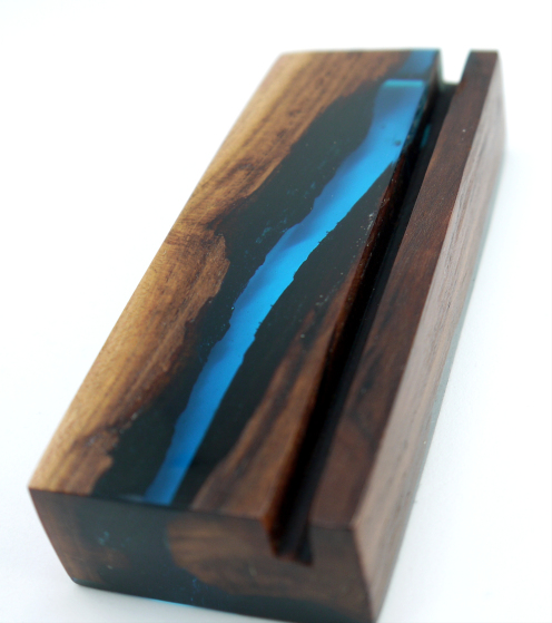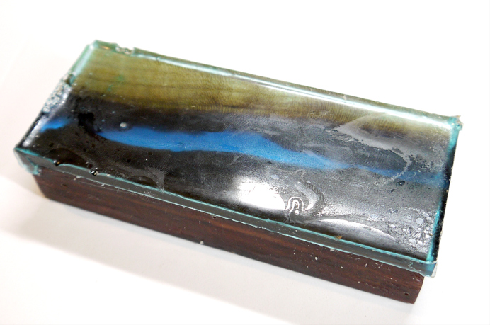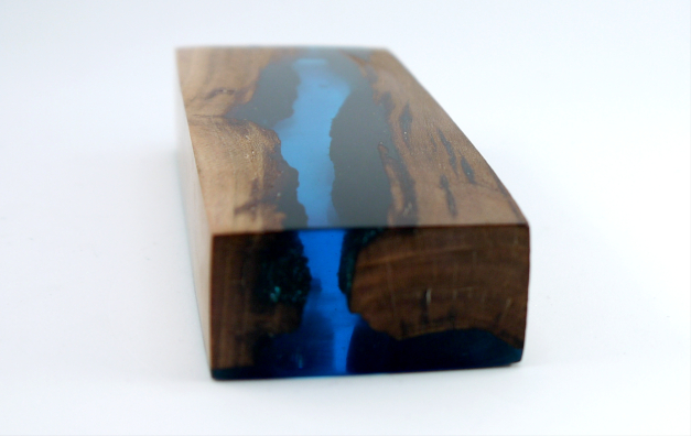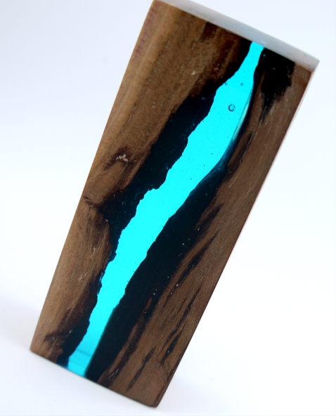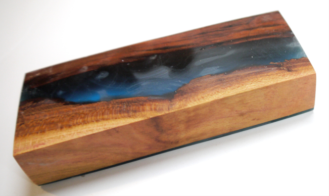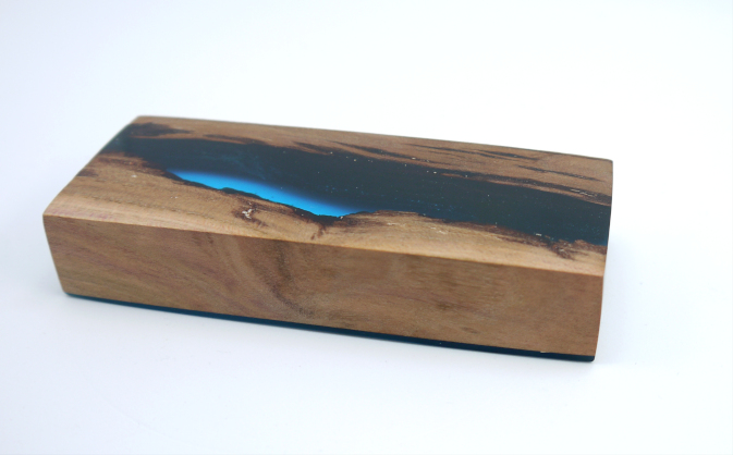 Ich habe mich beim Gießen für die Farbe Hellblau entschieden. Ich finde, dass diese sehr gut zum dunklen Rot-Braun des Kirschholzes passt und im Licht wunderschön reflektiert.
