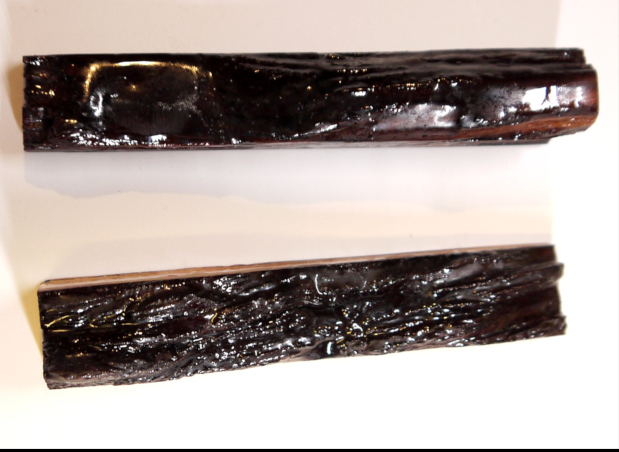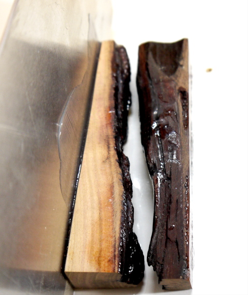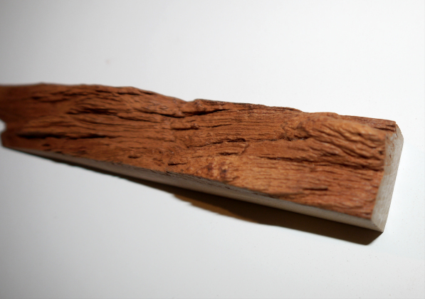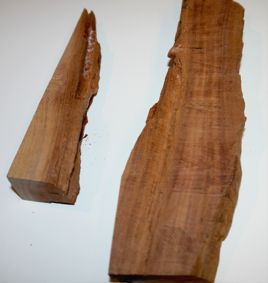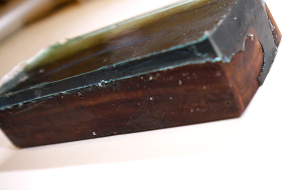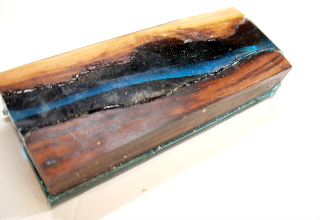 Ungefähr 7 Tage später und ein relativ anstrengendes Entfernen des zum Abdichten genutzten Silikon, konnte ich dann mit dem Rohling weiter machen. Gut zu erkennen ist die relativ ungenaue Oberfläche des Werkstücks mit einigen überhängenden Rändern oder relativ großen Rillen zwischen Holz und Epoxy.